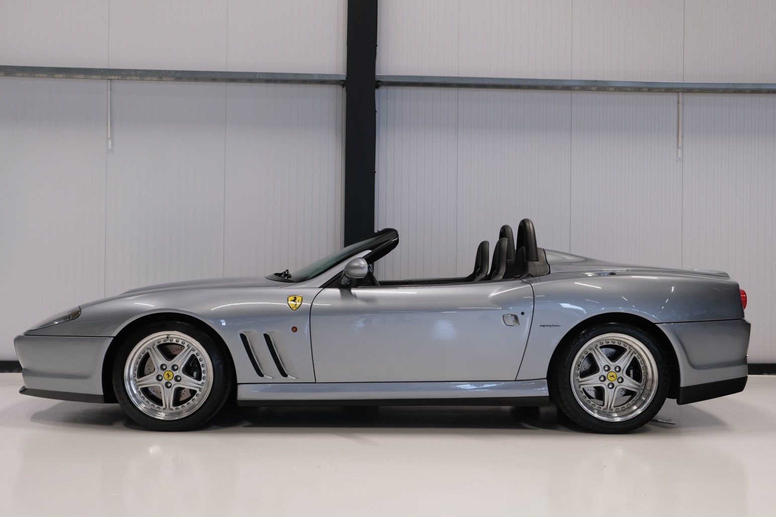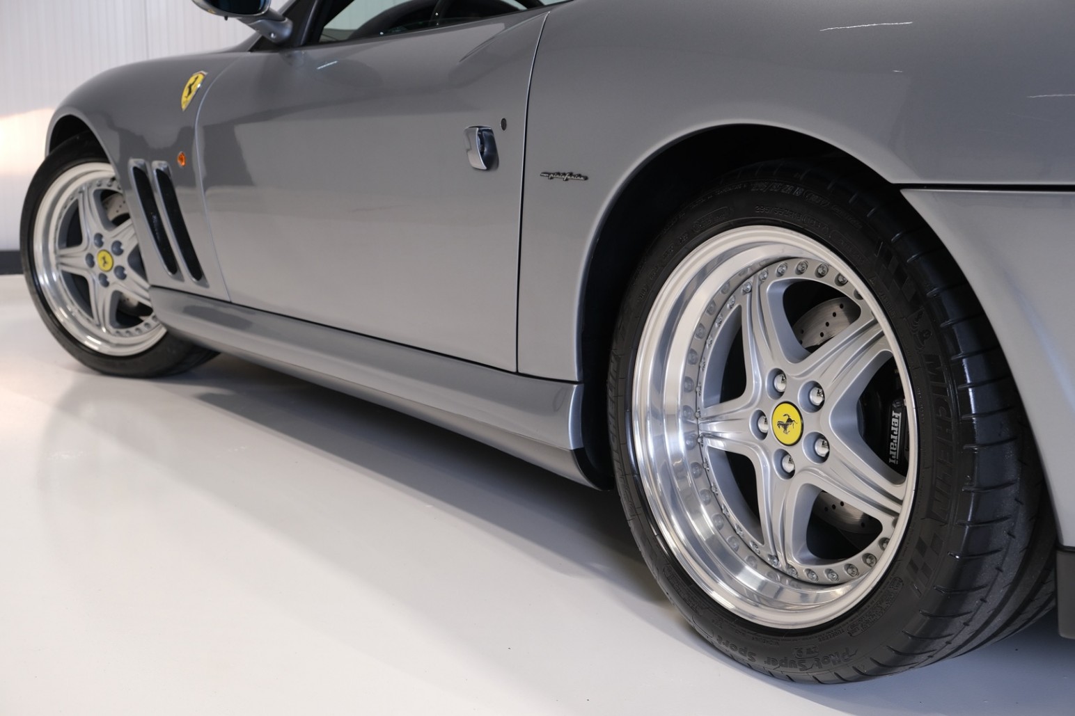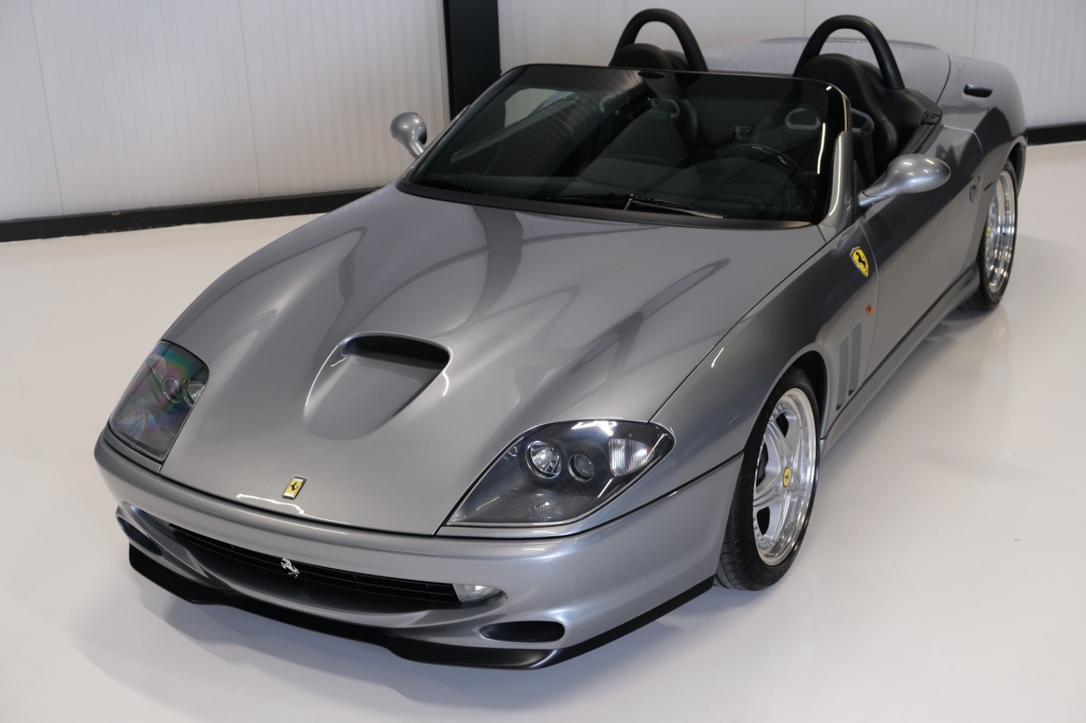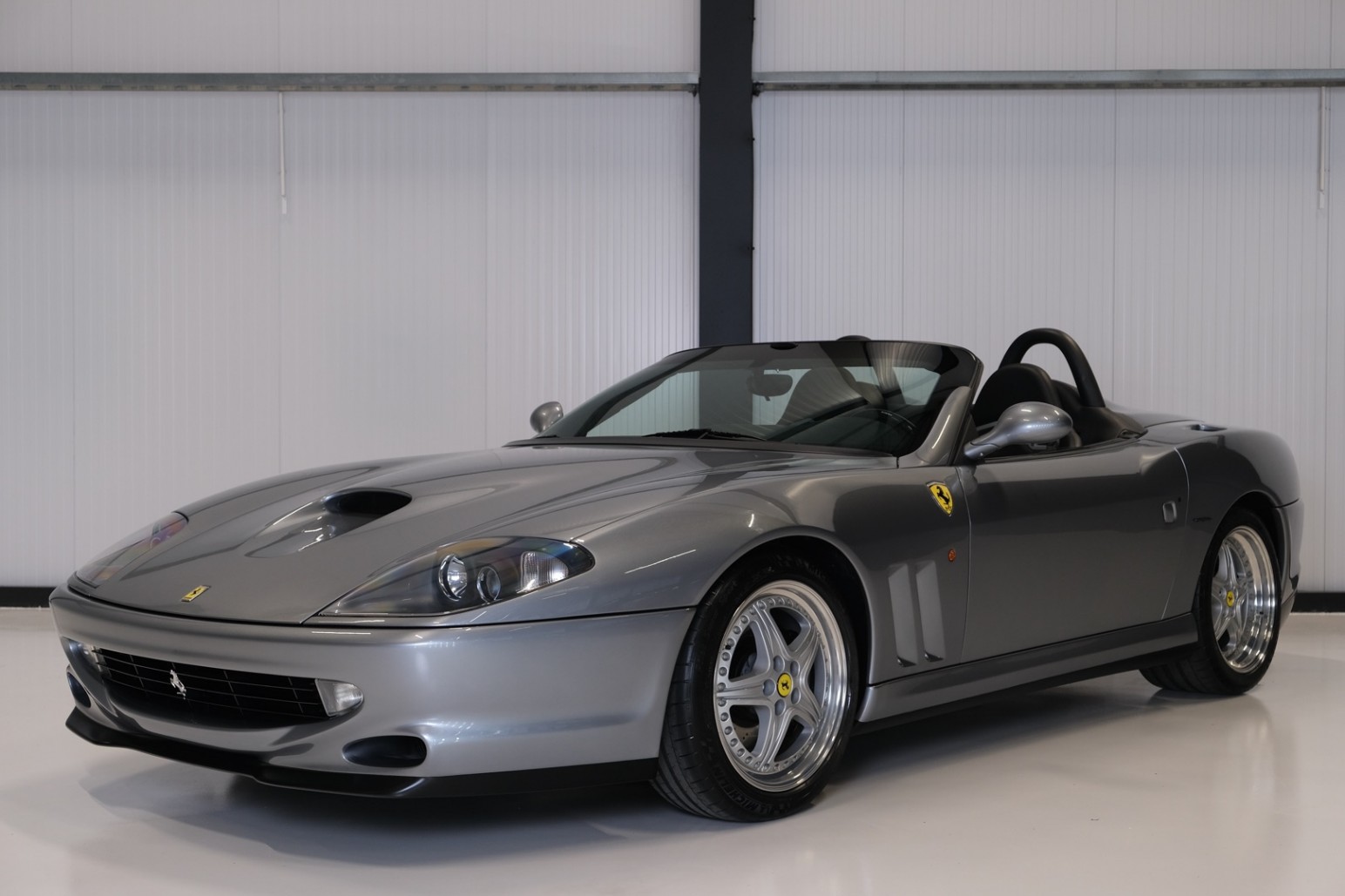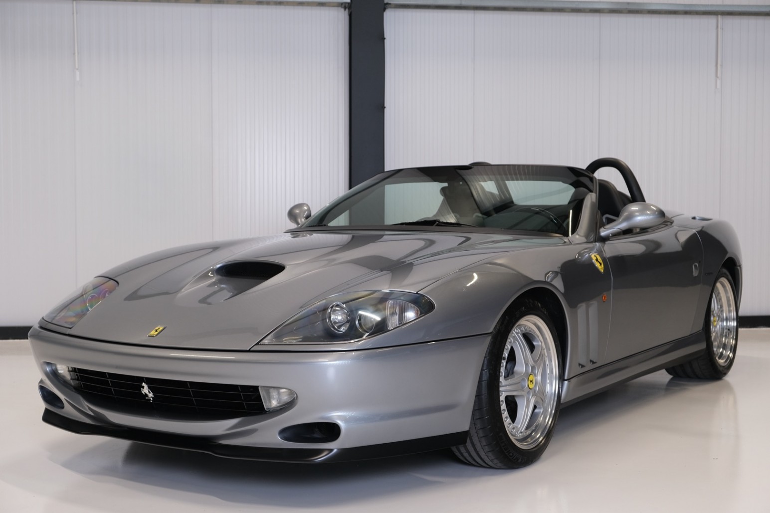 Afkomstig uit een verzameling: een zeer zeldzame Ferrari 550 Barchetta in de schitterende kleur Grigio Titanio. Klassiek gelijnde Ferrari met fijne rijeigenschappen. Dit exemplaar heeft een Michalak softtop waarmee men over de 200 km/u kan rijden (met het normale nooddakje kan max 120 mee gereden worden). Van dit dakje zijn maar een beperkt aantal gemaakt en wordt bij de auto geleverd net zoals de 2 originele carbon helmen. Duits geleverde Barchetta; nummer 380 van 448 stuks. Origineel slechts 9.672 km aantoonbaar en in topconditie.