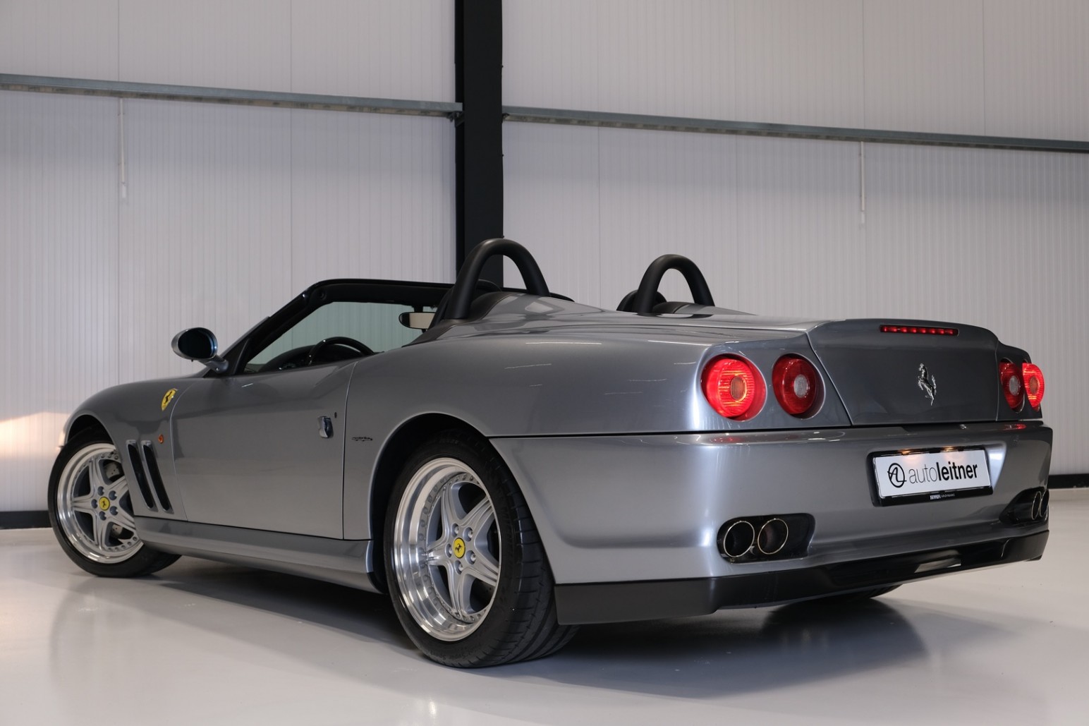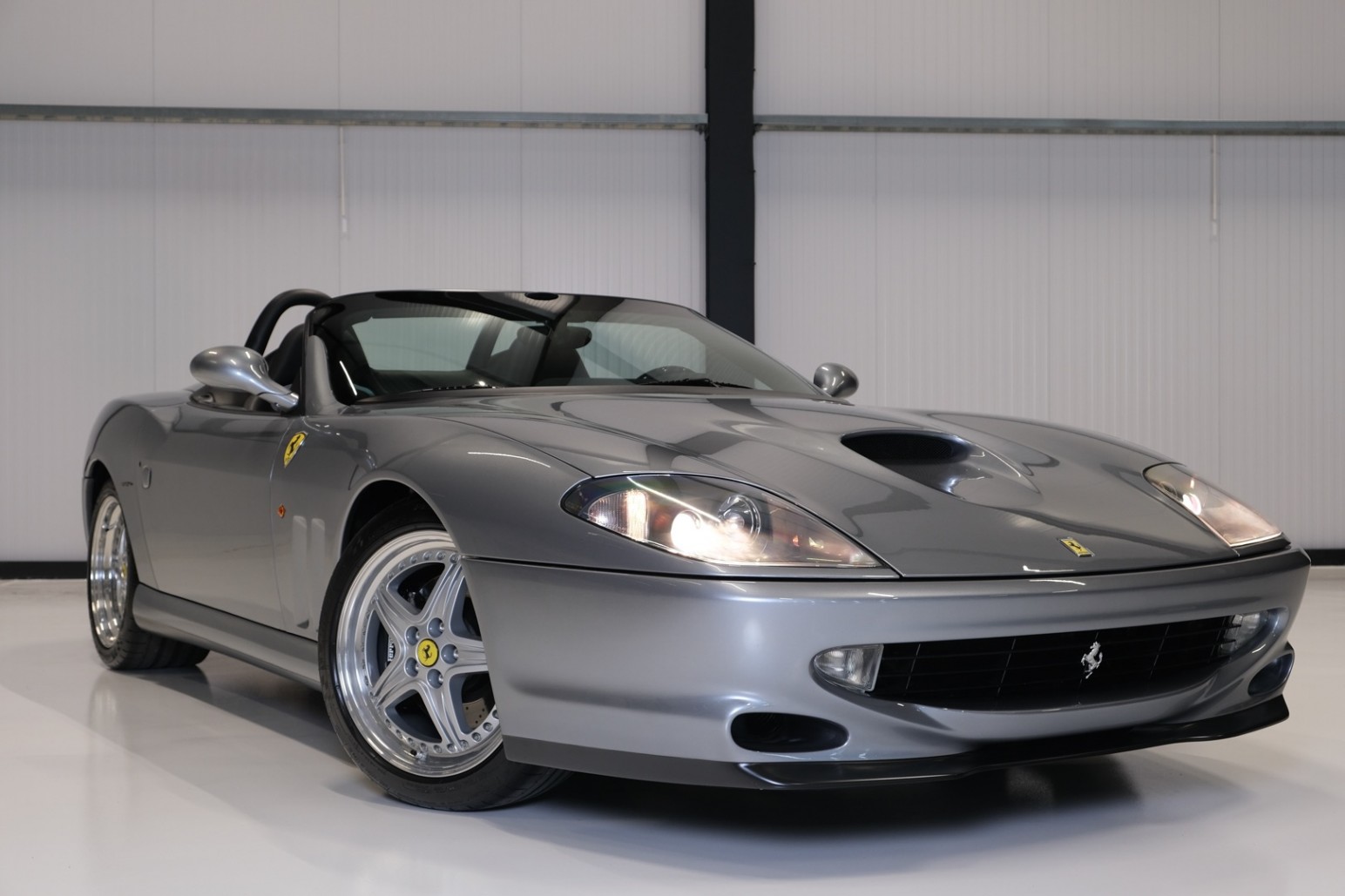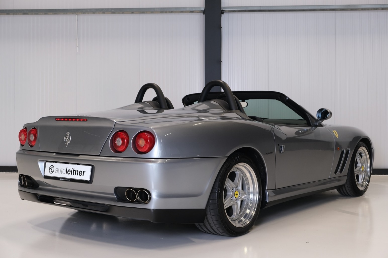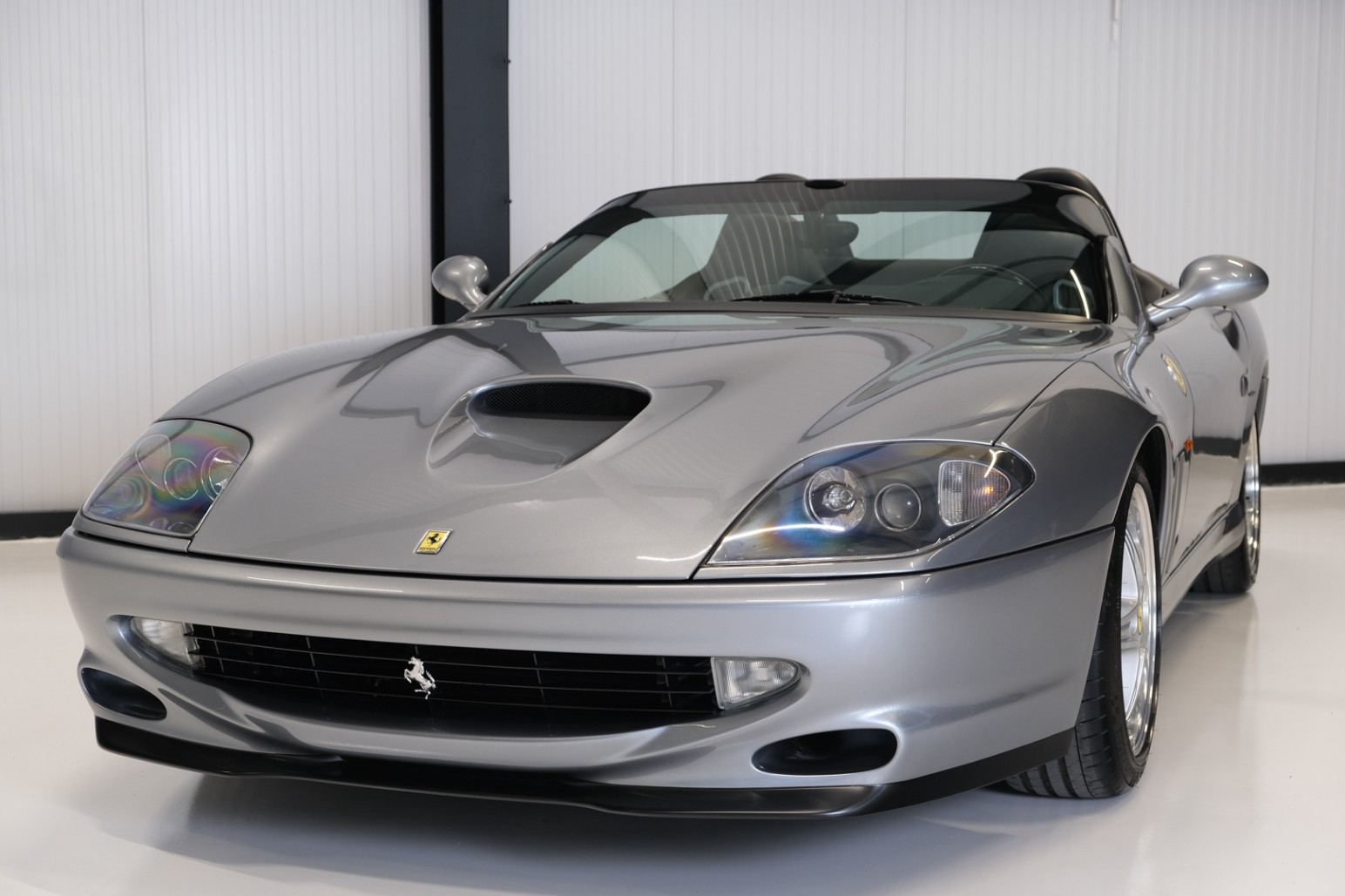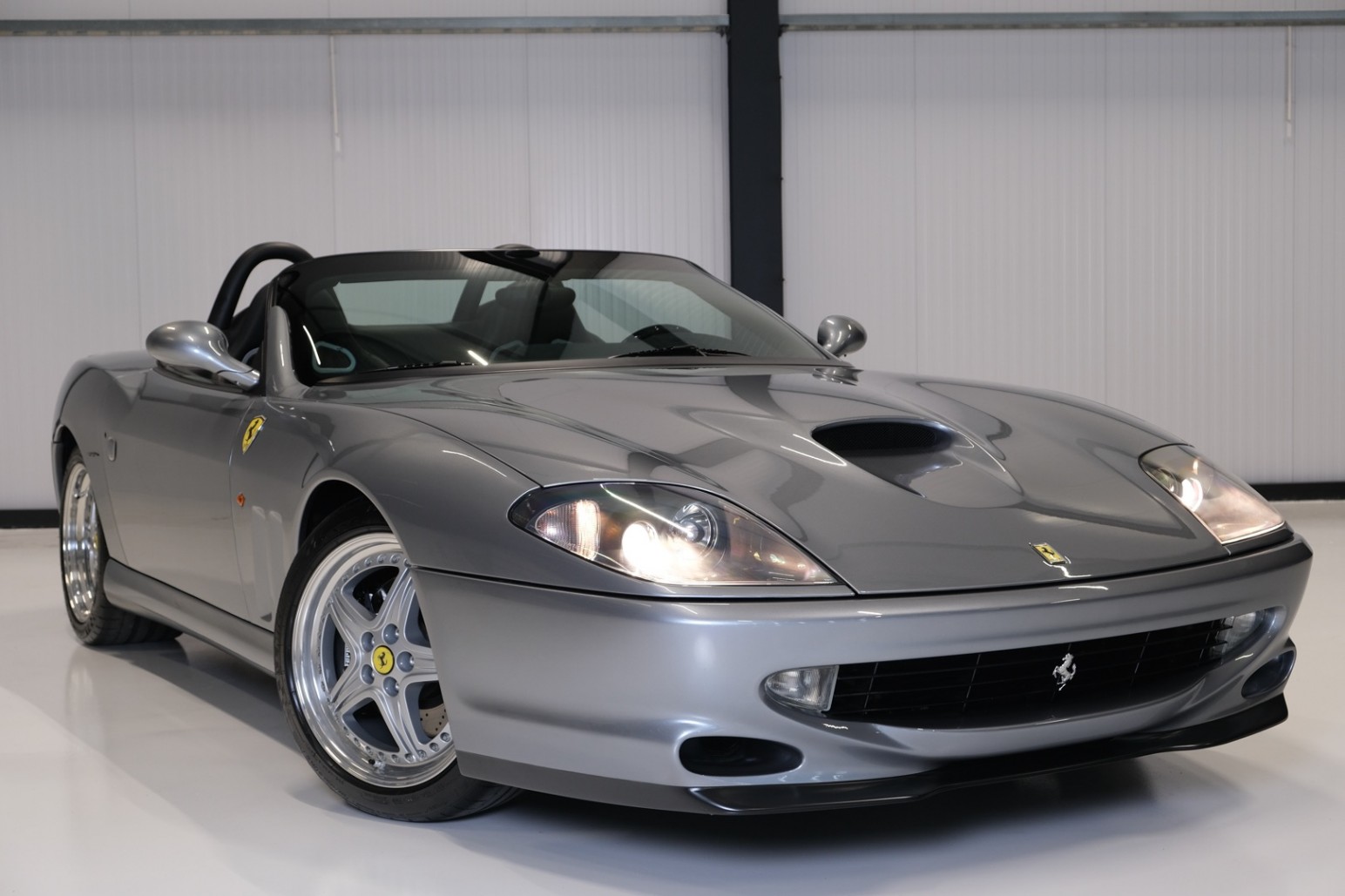 Afkomstig uit een verzameling: een zeer zeldzame Ferrari 550 Barchetta in de schitterende kleur Grigio Titanio. Klassiek gelijnde Ferrari met fijne rijeigenschappen. Dit exemplaar heeft een Michalak softtop waarmee men over de 200 km/u kan rijden (met het normale nooddakje kan max 120 mee gereden worden). Van dit dakje zijn maar een beperkt aantal gemaakt en wordt bij de auto geleverd net zoals de 2 originele carbon helmen. Duits geleverde Barchetta; nummer 380 van 448 stuks. Origineel slechts 9.672 km aantoonbaar en in topconditie.