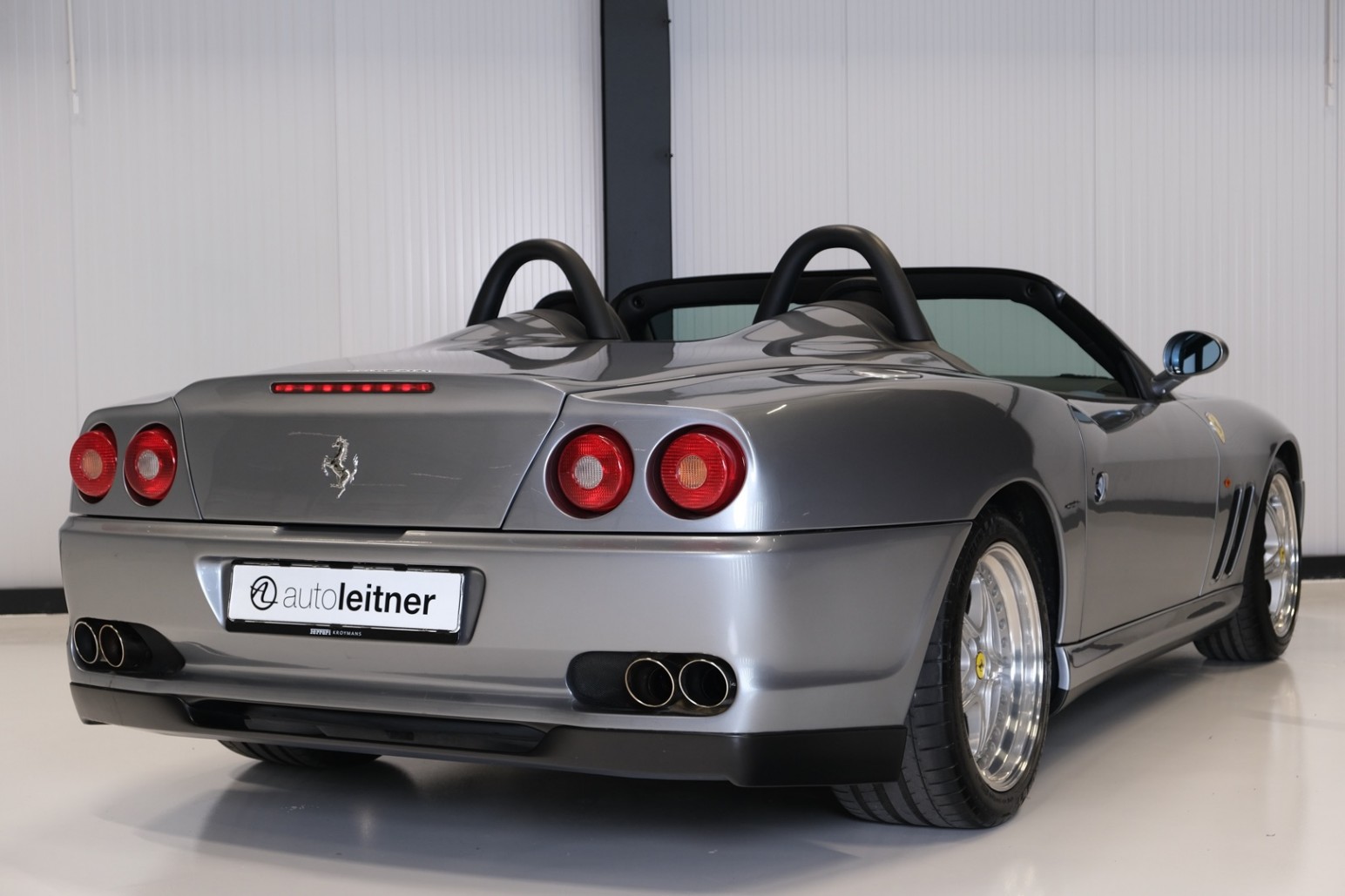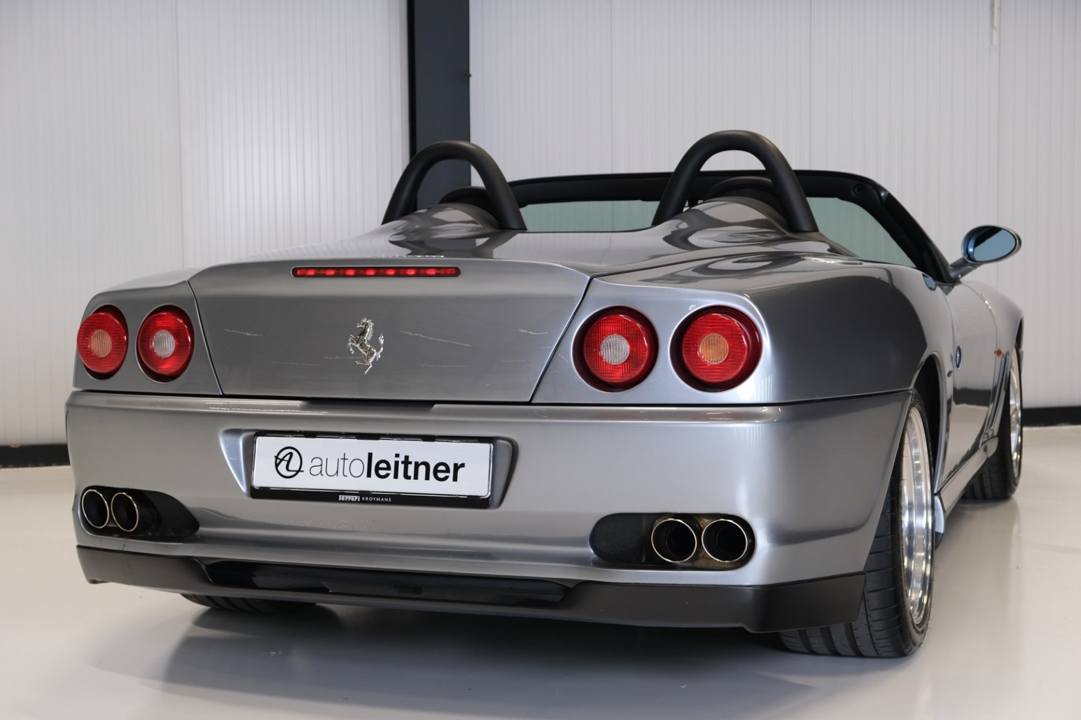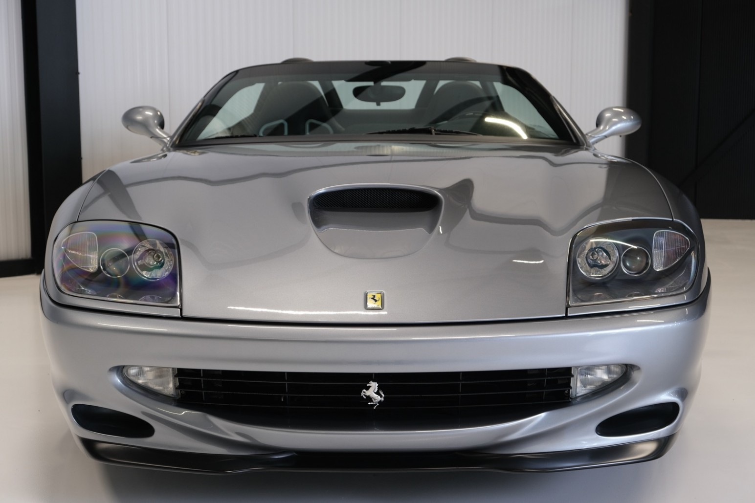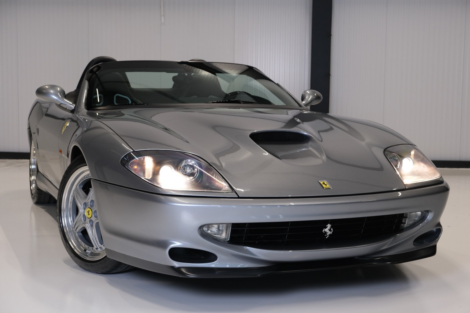 Afkomstig uit een verzameling: een zeer zeldzame Ferrari 550 Barchetta in de schitterende kleur Grigio Titanio. Klassiek gelijnde Ferrari met fijne rijeigenschappen. Dit exemplaar heeft een Michalak softtop waarmee men over de 200 km/u kan rijden (met het normale nooddakje kan max 120 mee gereden worden). Van dit dakje zijn maar een beperkt aantal gemaakt en wordt bij de auto geleverd net zoals de 2 originele carbon helmen. Duits geleverde Barchetta; nummer 380 van 448 stuks. Origineel slechts 9.672 km aantoonbaar en in topconditie.