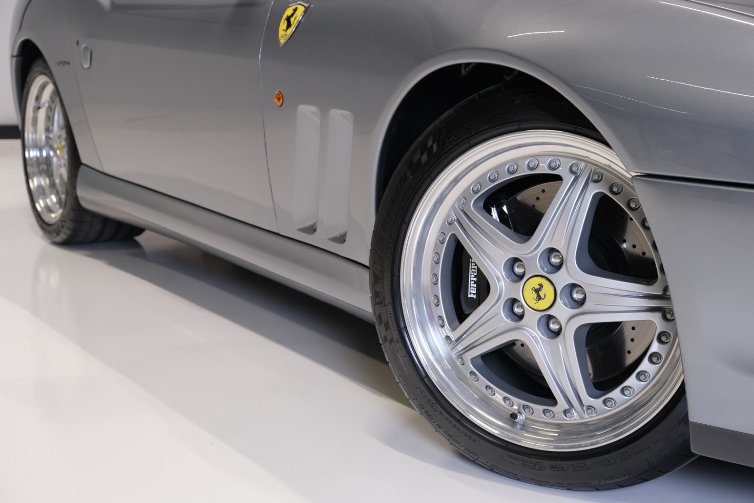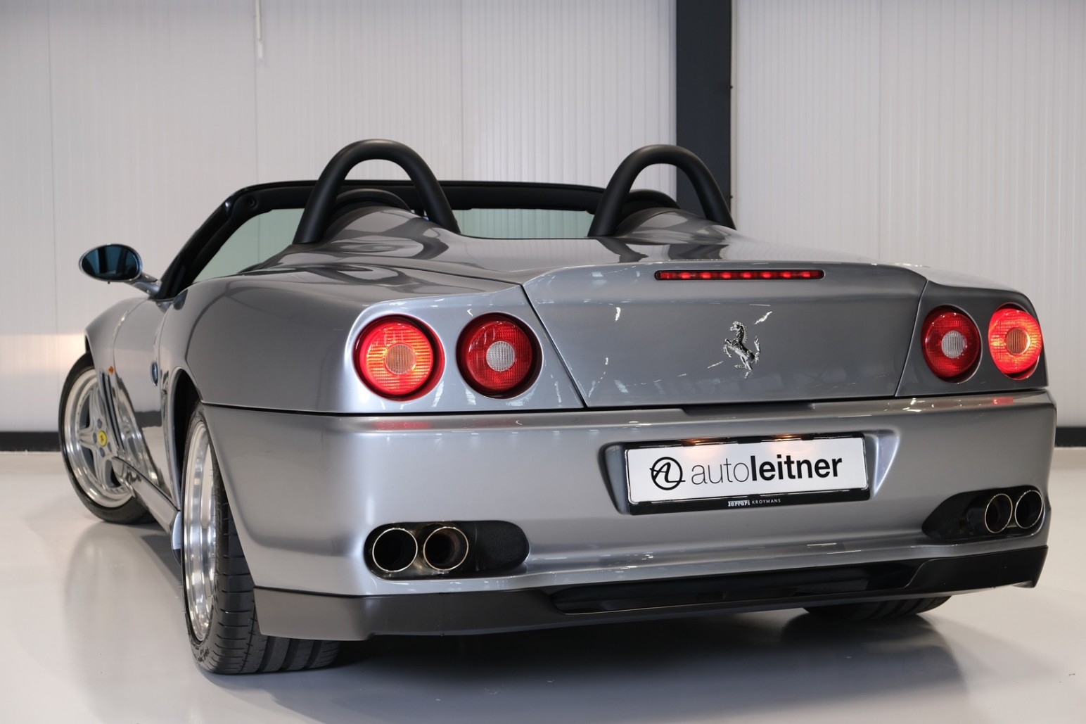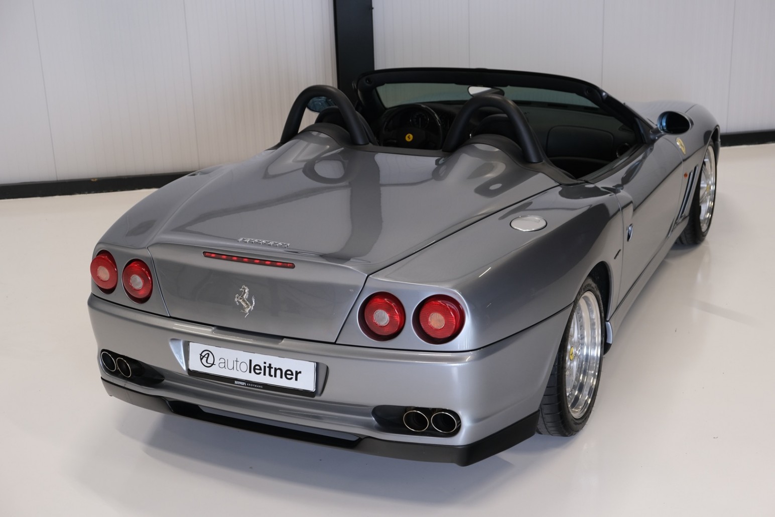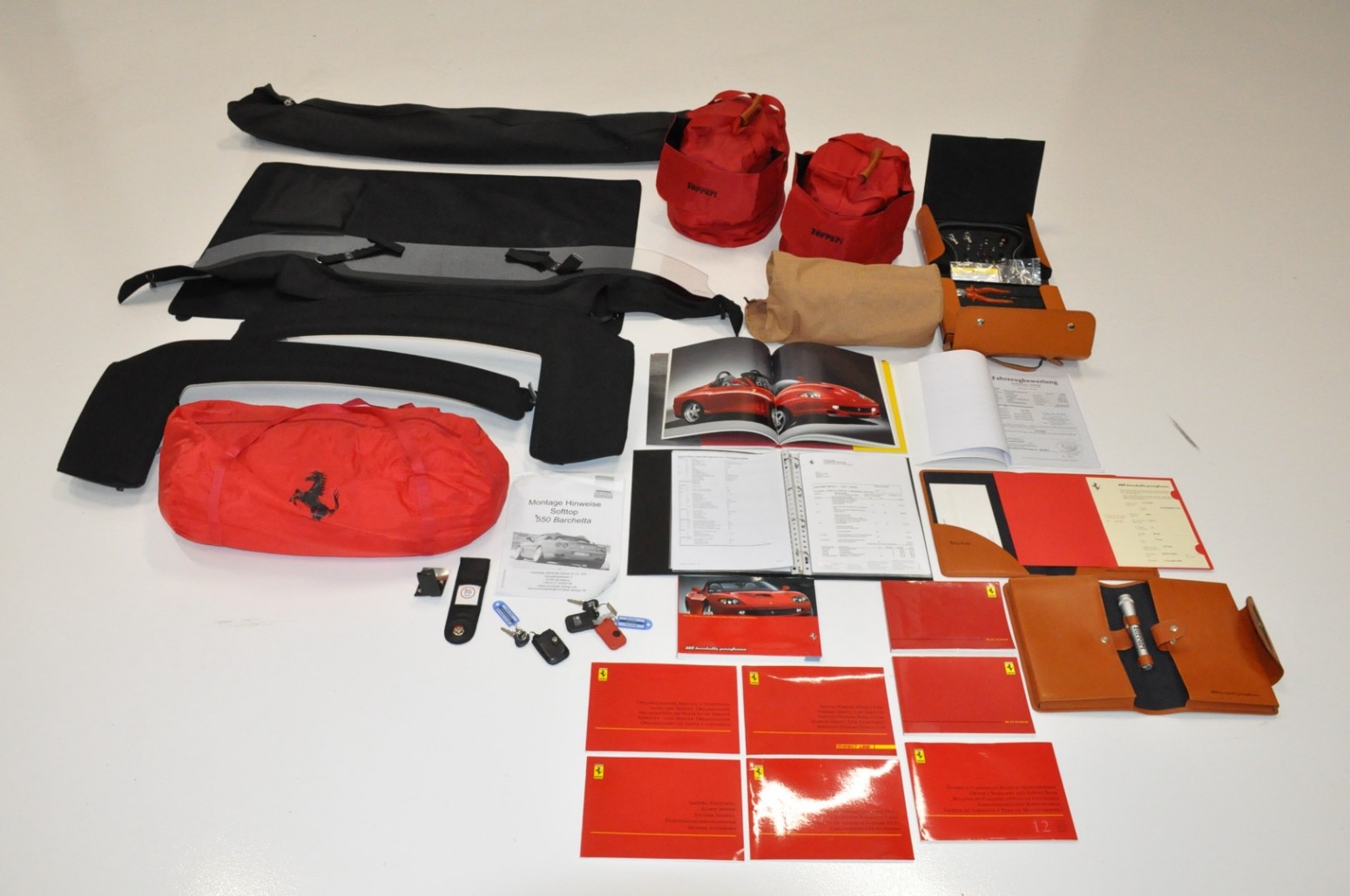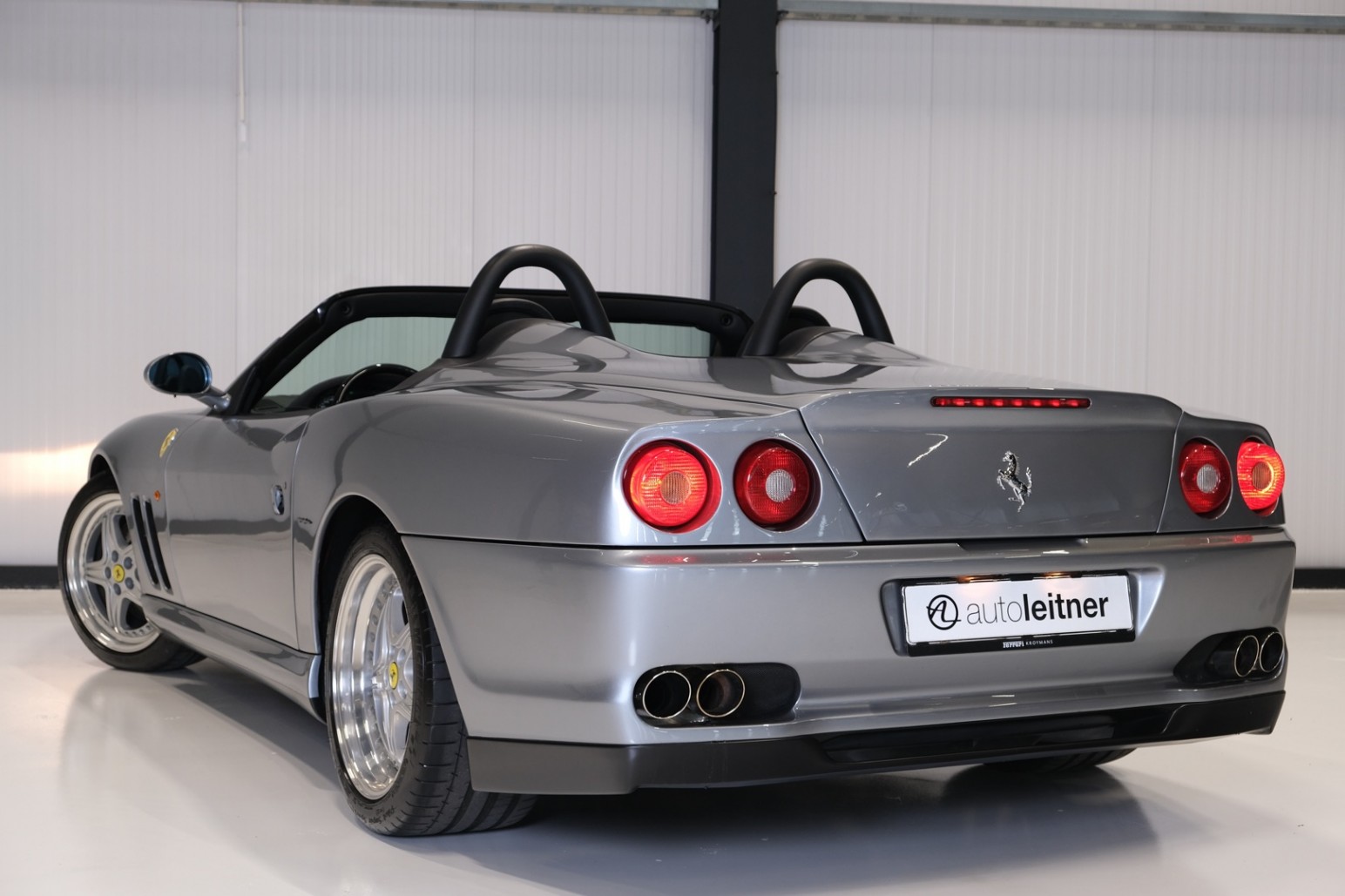 Afkomstig uit een verzameling: een zeer zeldzame Ferrari 550 Barchetta in de schitterende kleur Grigio Titanio. Klassiek gelijnde Ferrari met fijne rijeigenschappen. Dit exemplaar heeft een Michalak softtop waarmee men over de 200 km/u kan rijden (met het normale nooddakje kan max 120 mee gereden worden). Van dit dakje zijn maar een beperkt aantal gemaakt en wordt bij de auto geleverd net zoals de 2 originele carbon helmen. Duits geleverde Barchetta; nummer 380 van 448 stuks. Origineel slechts 9.672 km aantoonbaar en in topconditie.