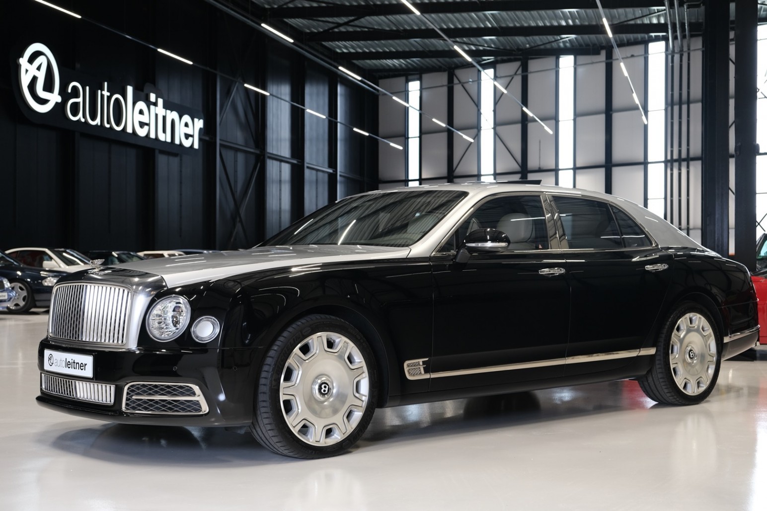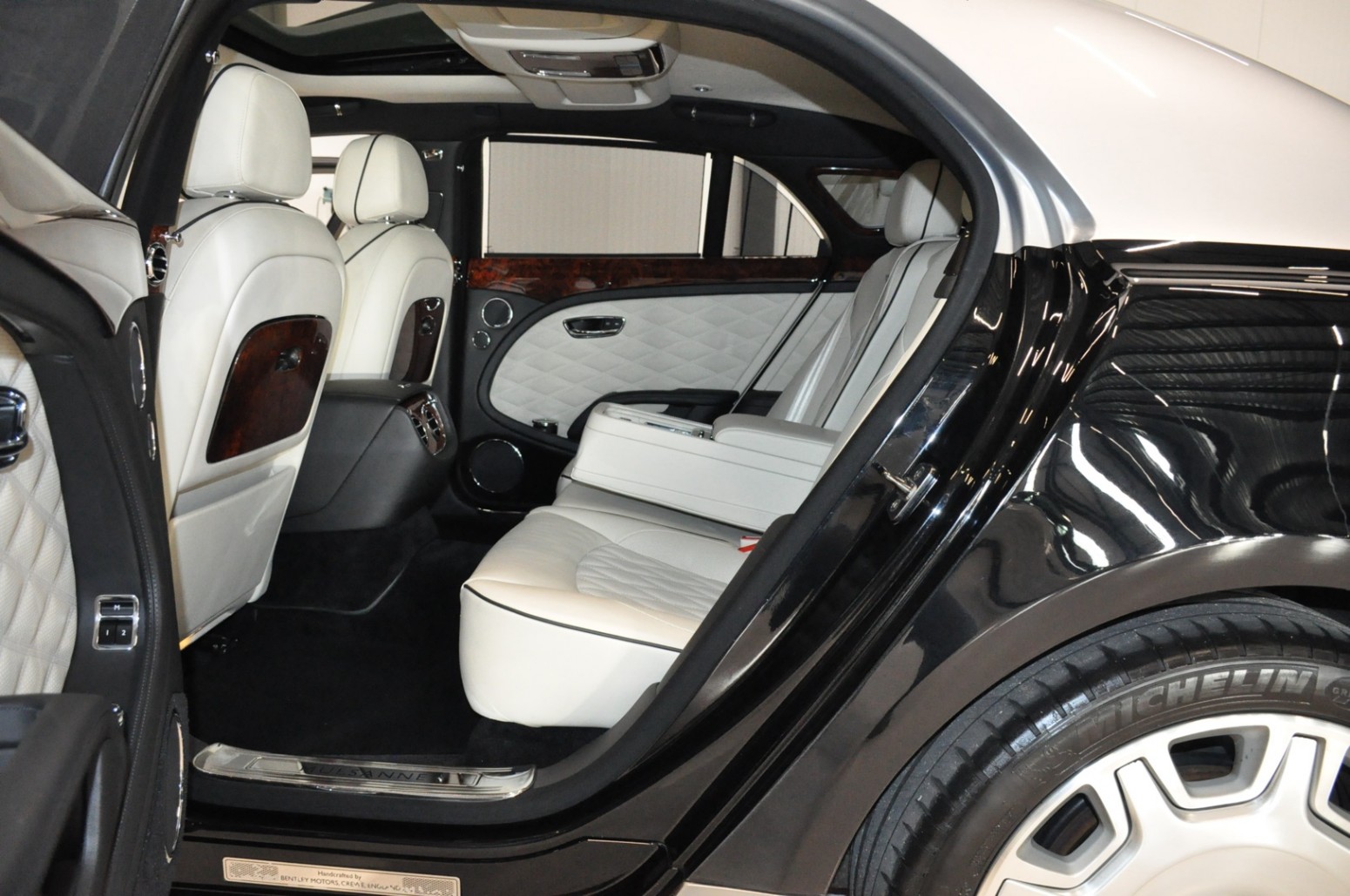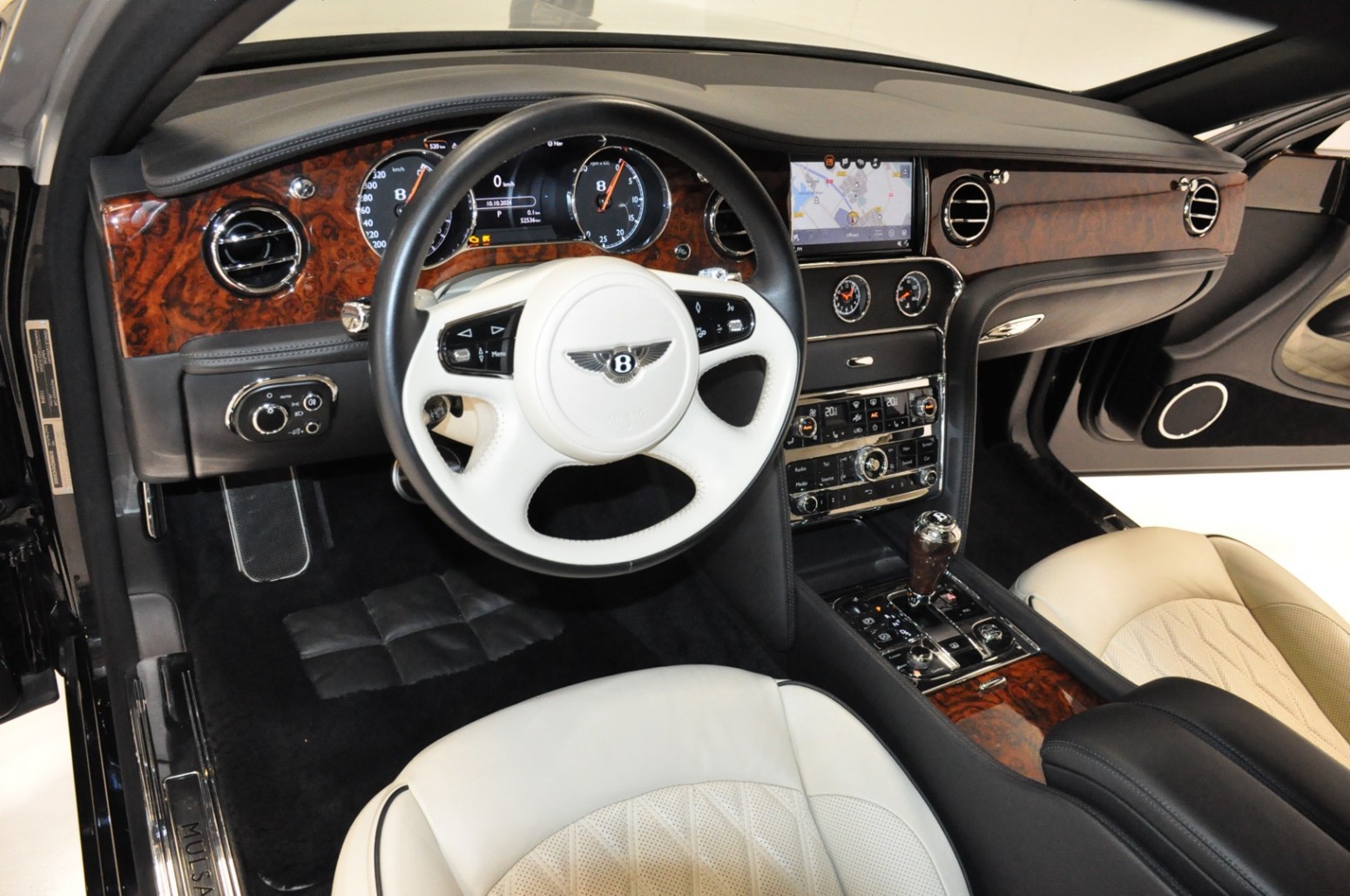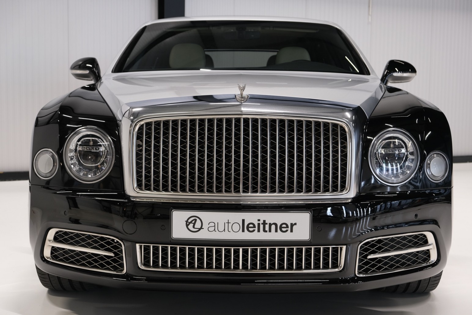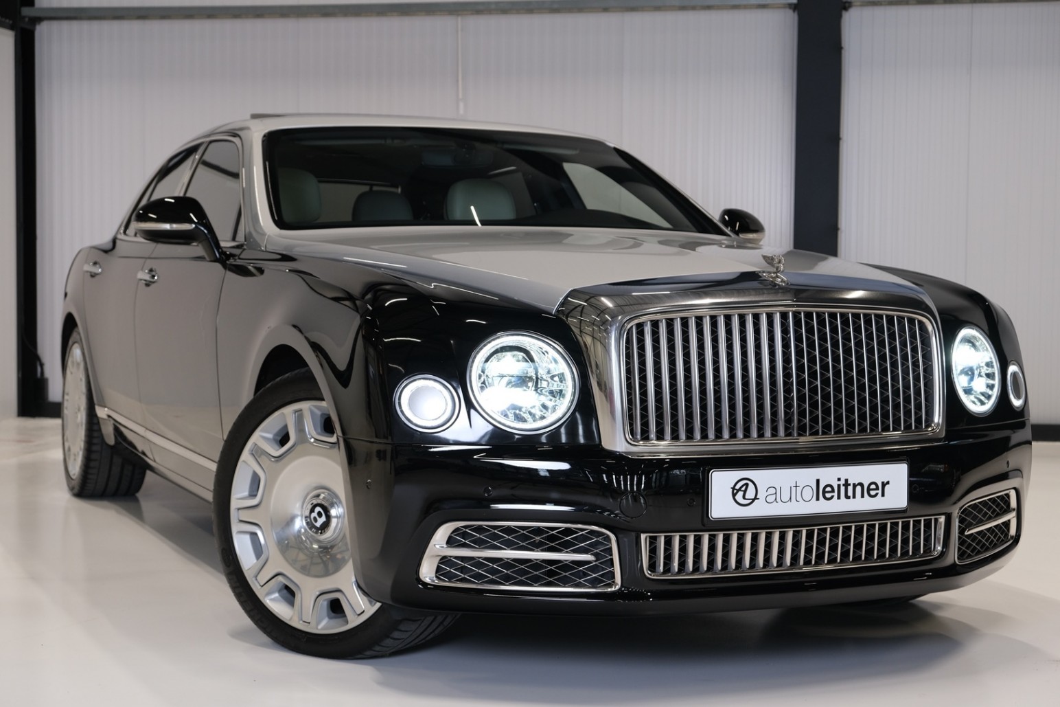 Uniek exemplaar, deze zeer fraai uitgevoerde facelift model 2017 Mulsanne Mulliner in L999 Special duopaint Moonbeam metallic over Beluga. Daarbij van binnen smaakvol in Champagne leder met zwarte bies en edelhout interieursierlijsten. Mooie opties aanwezig zoals het glazen dak, stoelmassage, -koeling, -verwarming met geheugen zowel voor als achter en meer. Origineel 52.536 km. Exportprijs 175.000,- euro.