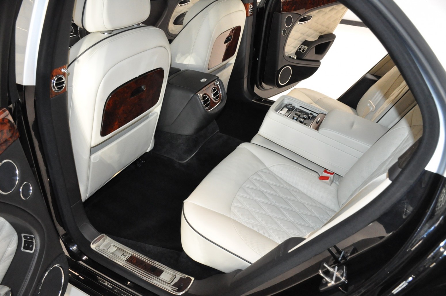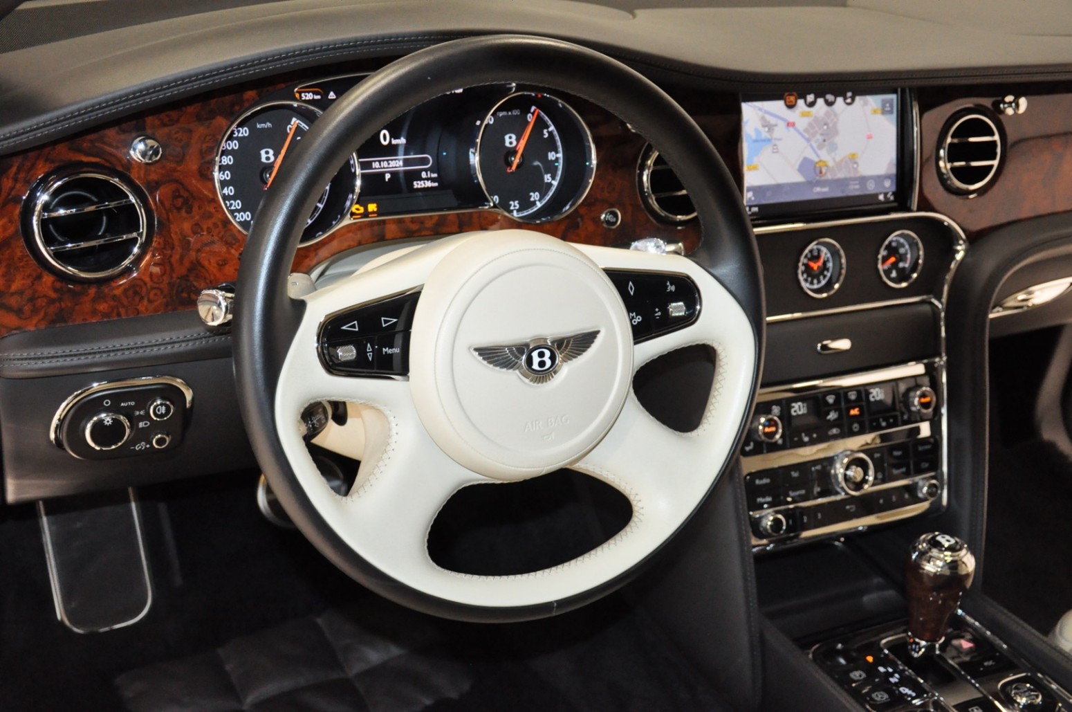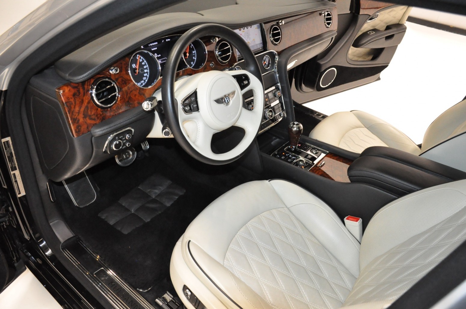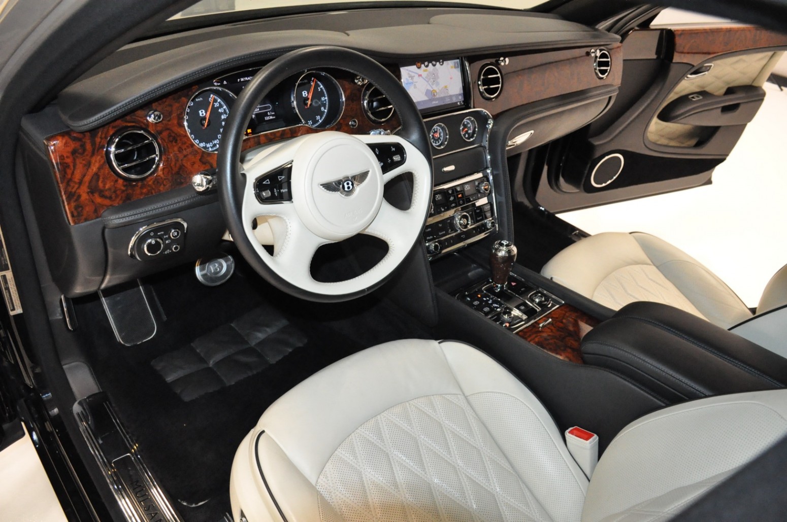 Uniek exemplaar, deze zeer fraai uitgevoerde facelift model 2017 Mulsanne Mulliner in L999 Special duopaint Moonbeam metallic over Beluga. Daarbij van binnen smaakvol in Champagne leder met zwarte bies en edelhout interieursierlijsten. Mooie opties aanwezig zoals het glazen dak, stoelmassage, -koeling, -verwarming met geheugen zowel voor als achter en meer. Origineel 52.536 km. Exportprijs 175.000,- euro.