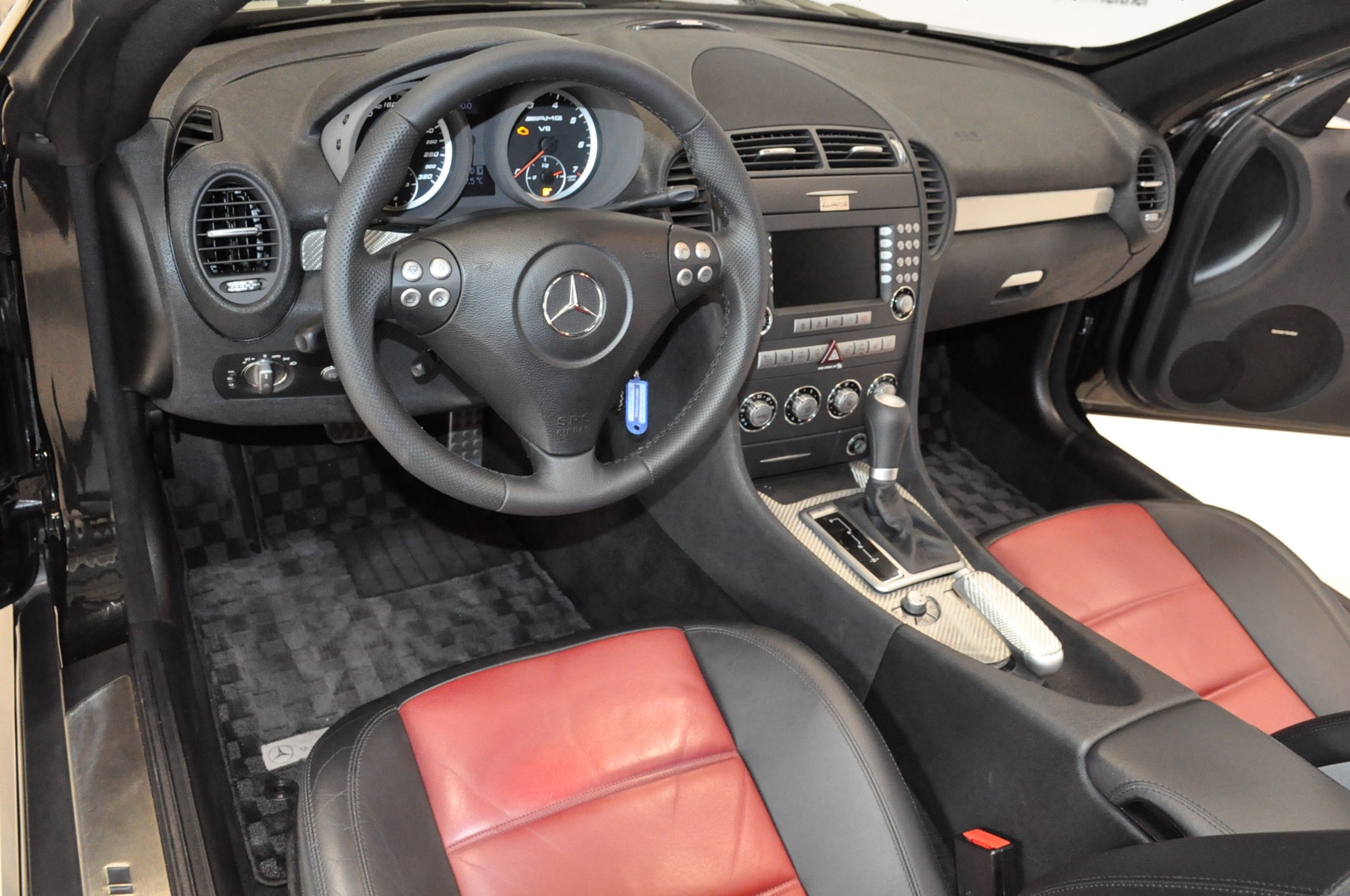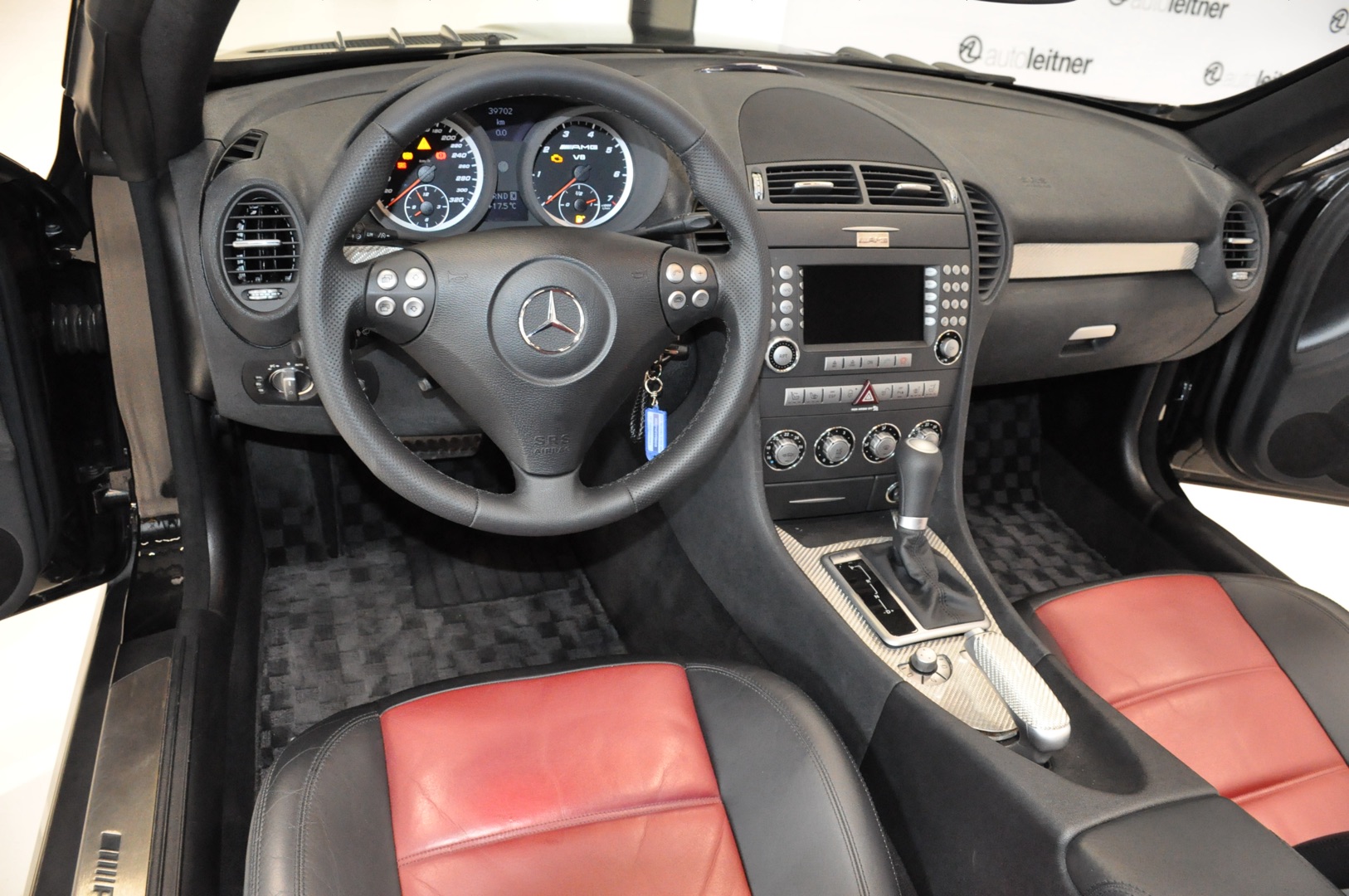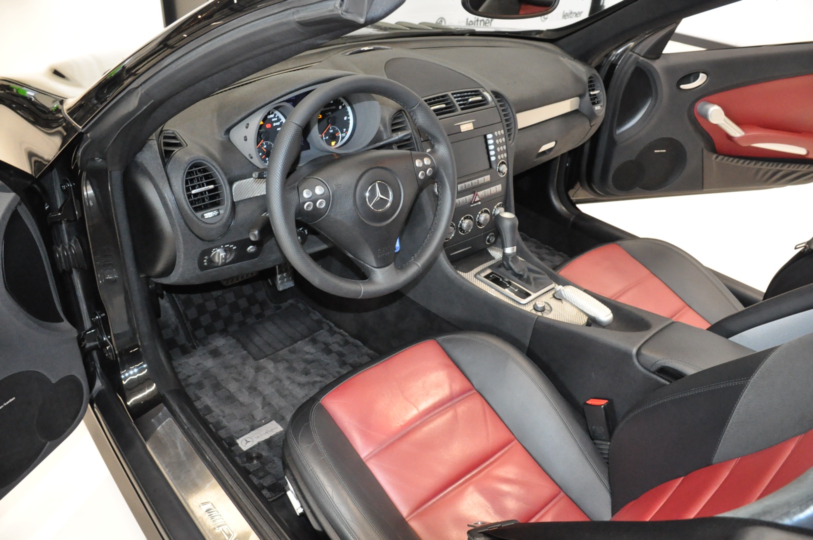 Op voorraad deze 2005 Mercedes-Benz SLK 55 AMG Roadster R171 met origineel slechts 39.702 km. Uitgevoerd in 197 Obsidianschwarz metallic met 857 Leder schwarz/rot en Lorinser pakket. Destijds nieuw geleverd in Japan en aantal jaar geleden in Nederland geregistreerd. Volledig eerste lak en in keurige staat.