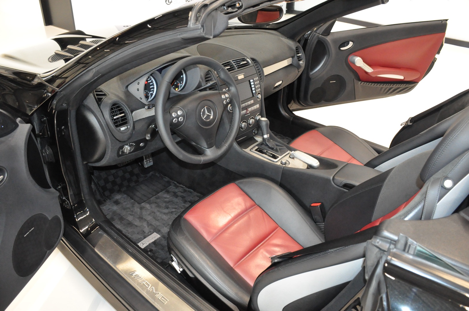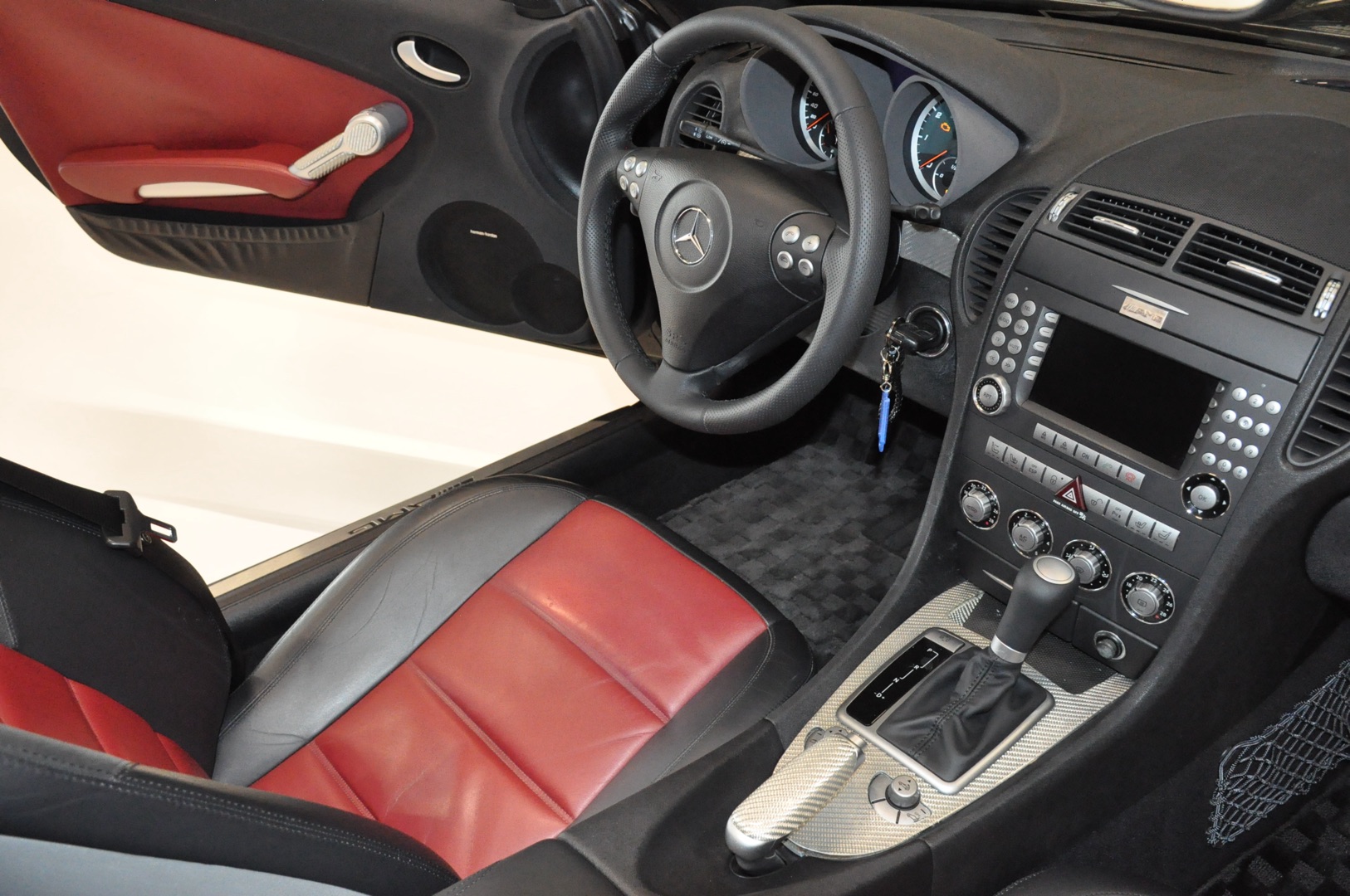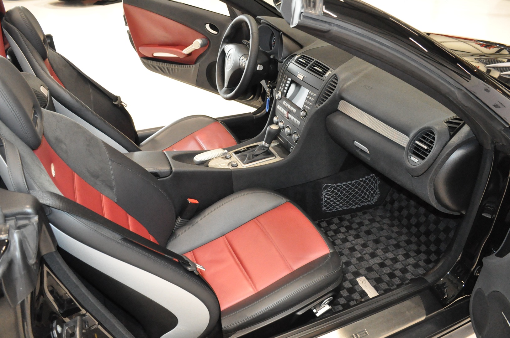 Op voorraad deze 2005 Mercedes-Benz SLK 55 AMG Roadster R171 met origineel slechts 39.702 km. Uitgevoerd in 197 Obsidianschwarz metallic met 857 Leder schwarz/rot en Lorinser pakket. Destijds nieuw geleverd in Japan en aantal jaar geleden in Nederland geregistreerd. Volledig eerste lak en in keurige staat.
